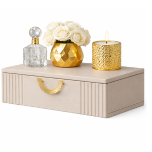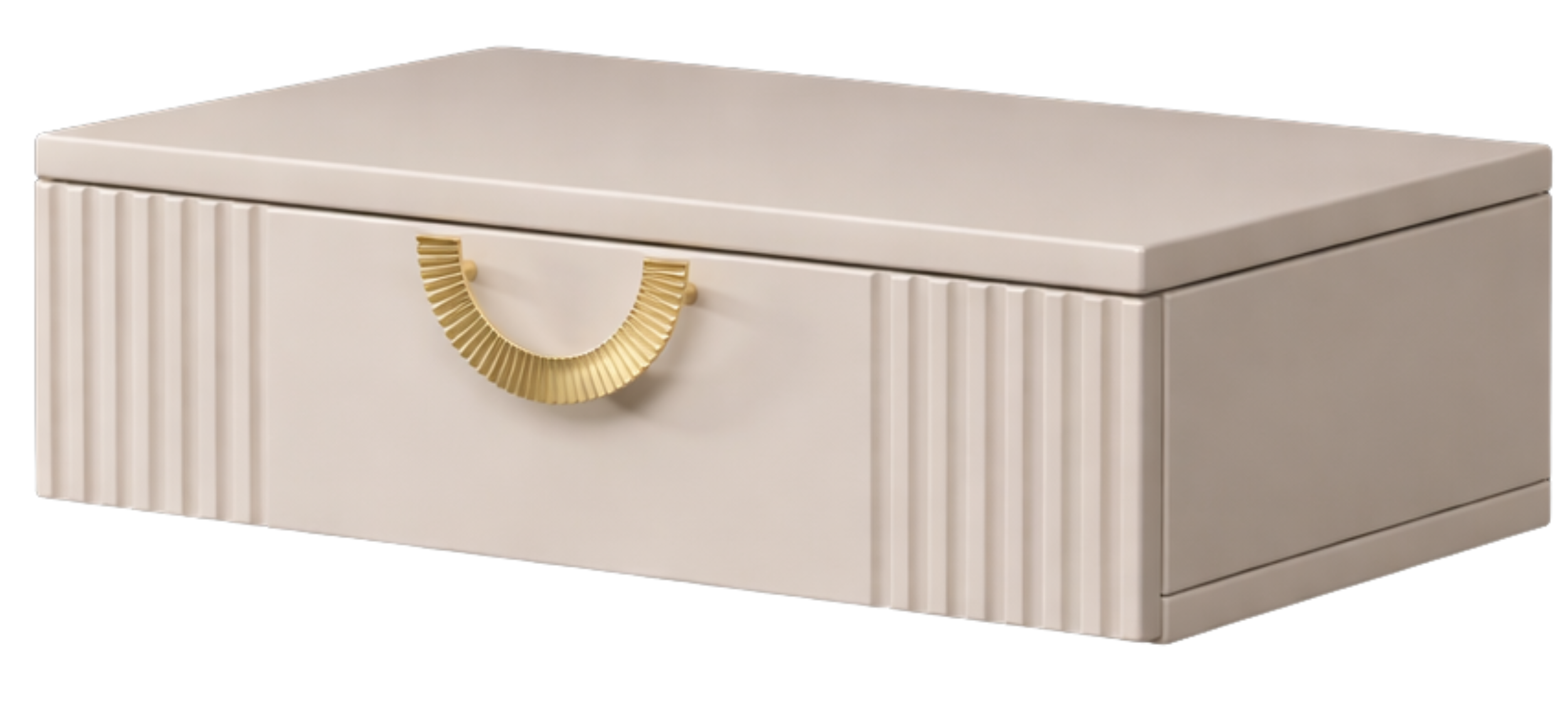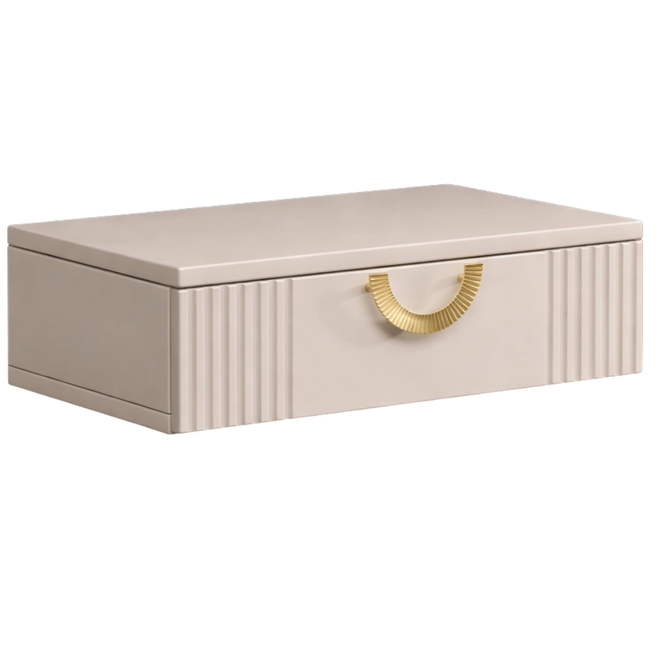 Elegancka szafka wisząca w kolorze kaszmir z ryflowanym frontem i złotym uchwytem to stylowe i funkcjonalne rozwiązanie do nowoczesnych wnętrz. Podwieszana konstrukcja nadaje lekkości, a pojemna szuflada zapewnia wygodne miejsce do przechowywania. Idealna jako stolik nocny lub szafka do salonu w stylu glamour.