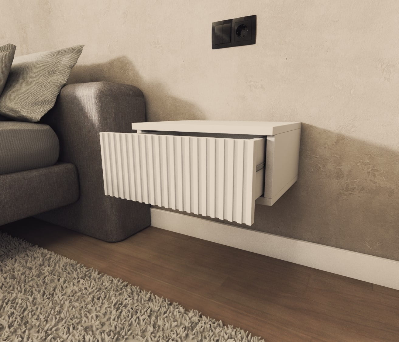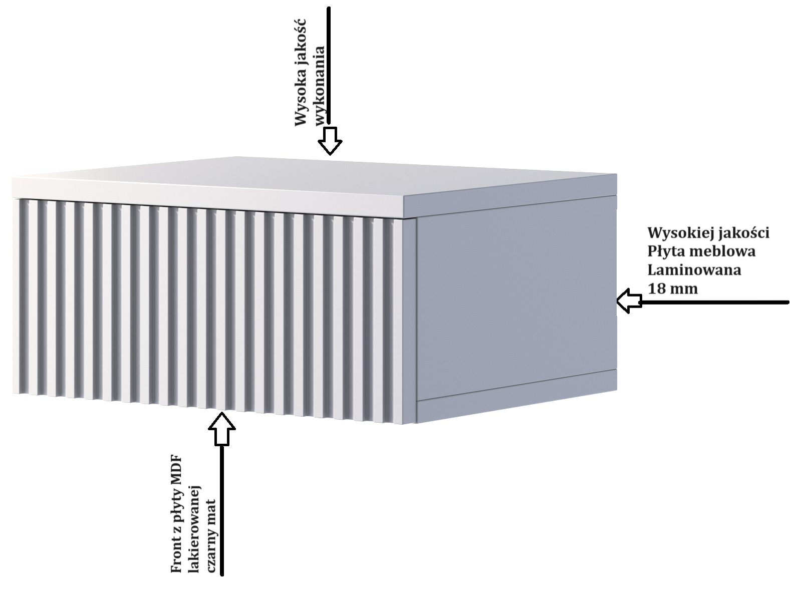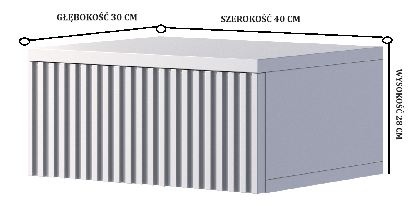 Dodaj nowoczesny akcent do swojej sypialni z naszą elegancką szafką nocną podwieszaną, która łączy w sobie styl, trwałość i funkcjonalność. Ta wyjątkowa szafka jest idealnym rozwiązaniem dla osób ceniących sobie wysoką jakość i estetykę.Front szafki został wykonany z lakierowanej płyty MDF, charakteryzującej się wyjątkową strukturą ryflowaną. Dodaje to nowoczesnego i eleganckiego wyglądu, który z pewnością przyciągnie wzrok.Pojemna szuflada zapewnia bowiem dużo miejsca do przechowywania różnych prywatnych przedmiotów. Dzięki swojej funkcjonalności, szafka nocna pozwala na utrzymanie porządku w sypialni i zapewnia dogodny dostęp do niezbędnych rzeczy na wyciągnięcie ręki.