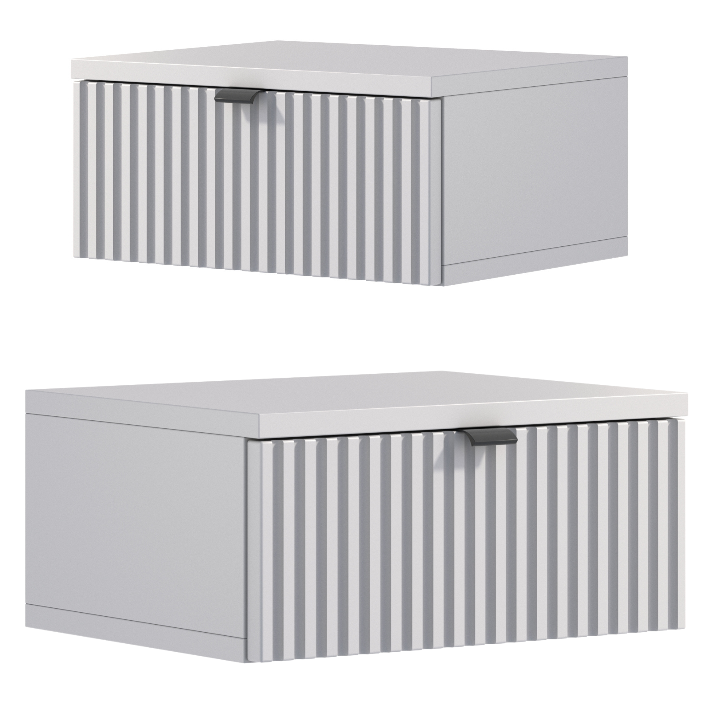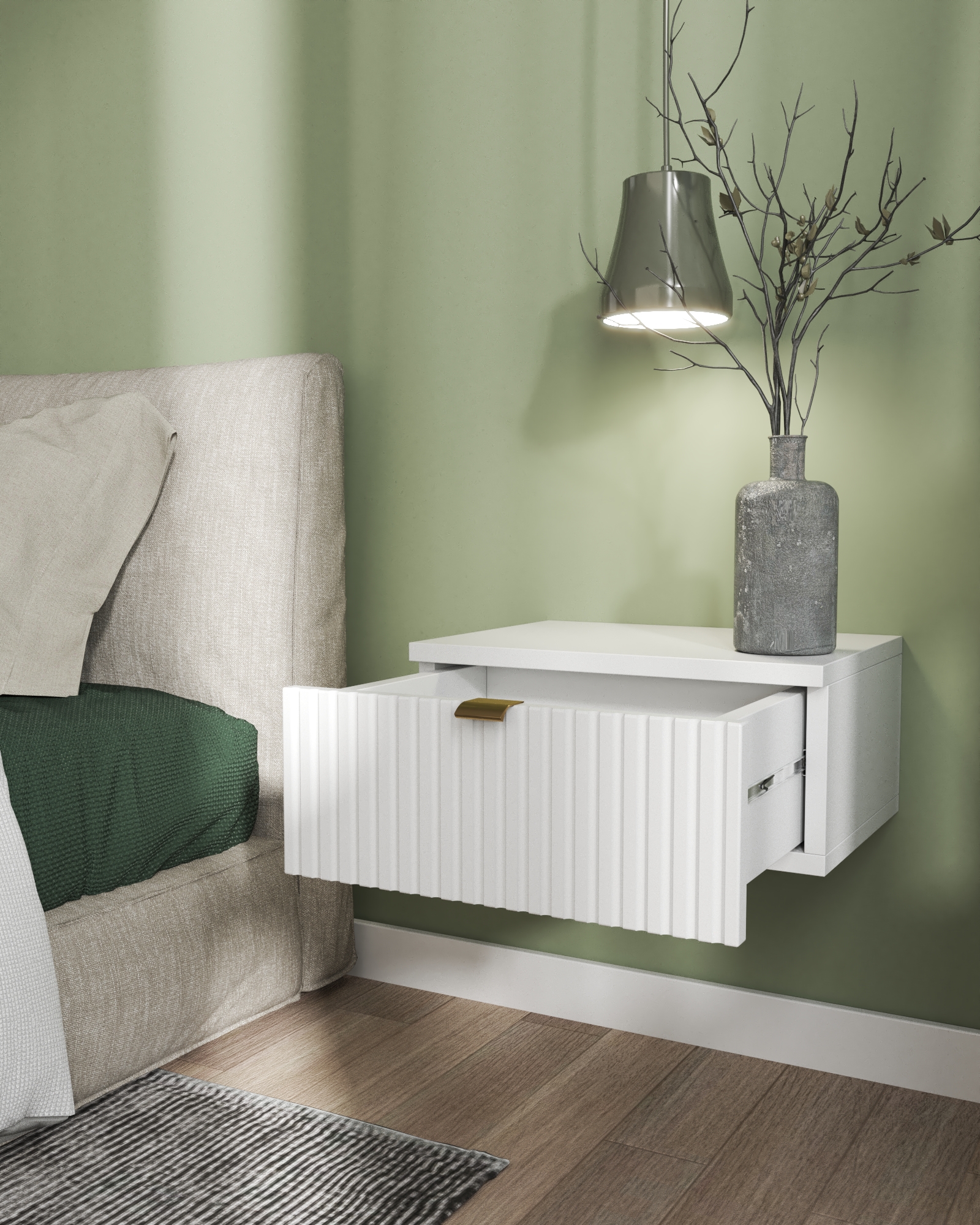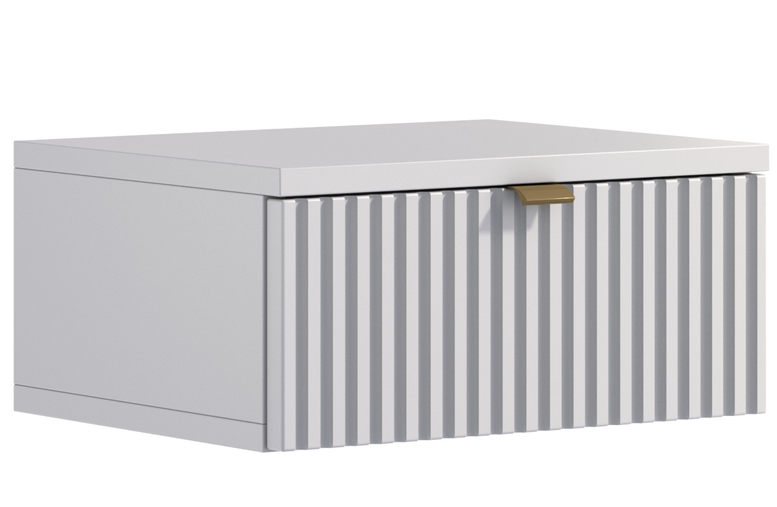 Dodaj nowoczesny akcent do swojej sypialni z naszą elegancką szafką nocną podwieszaną, która łączy w sobie styl, trwałość i funkcjonalność. Ta wyjątkowa szafka jest idealnym rozwiązaniem dla osób ceniących sobie wysoką jakość i estetykę.Front szafki został wykonany z lakierowanej płyty MDF, charakteryzującej się wyjątkową strukturą ryflowaną. Dodaje to nowoczesnego i eleganckiego wyglądu, który z pewnością przyciągnie wzrok.Pojemna szuflada zapewnia bowiem dużo miejsca do przechowywania różnych prywatnych przedmiotów. Dzięki swojej funkcjonalności, szafka nocna pozwala na utrzymanie porządku w sypialni i zapewnia dogodny dostęp do niezbędnych rzeczy na wyciągnięcie ręki.