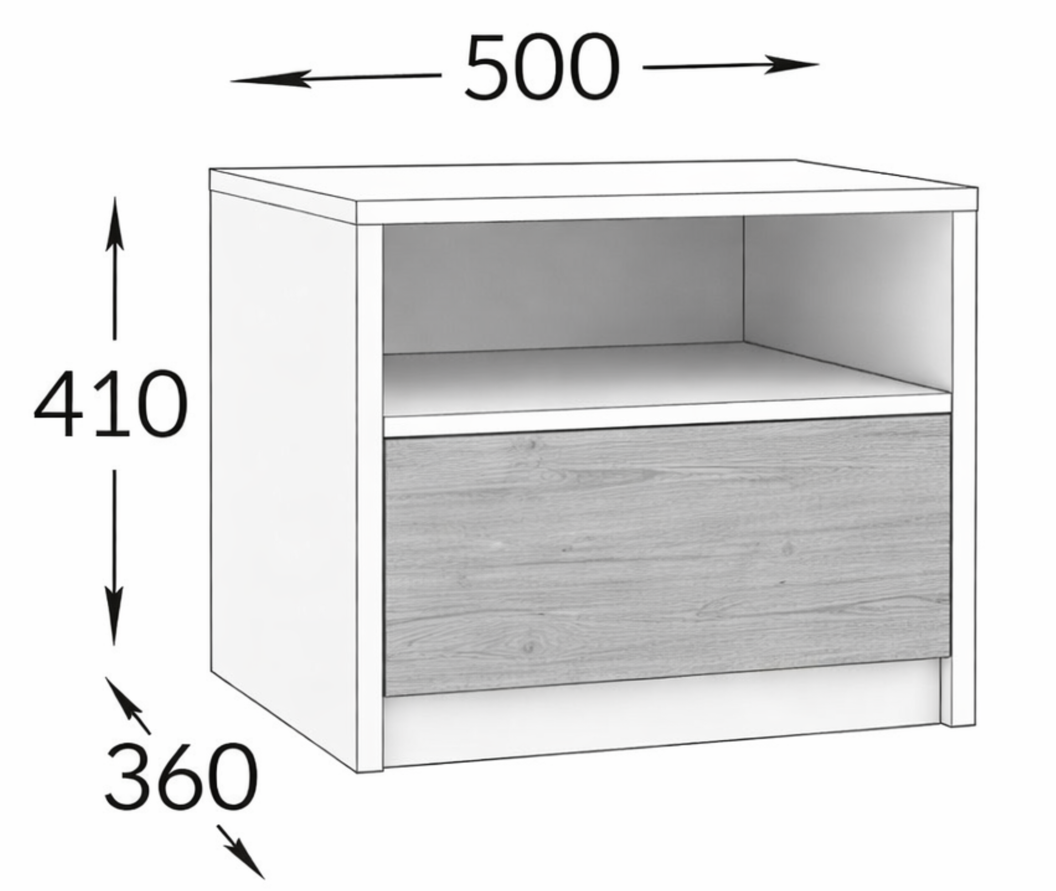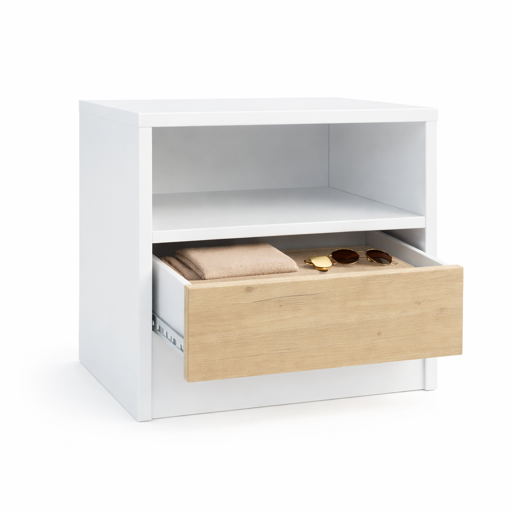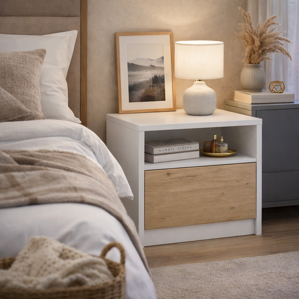 Model został zaprojektowany z myślą o osobach ceniących porządek i prostą formę. Zamknięta komora pozwala schować drobiazgi, takie jak książki, ładowarki czy akcesoria, dzięki czemu przestrzeń przy łóżku pozostaje uporządkowana.
