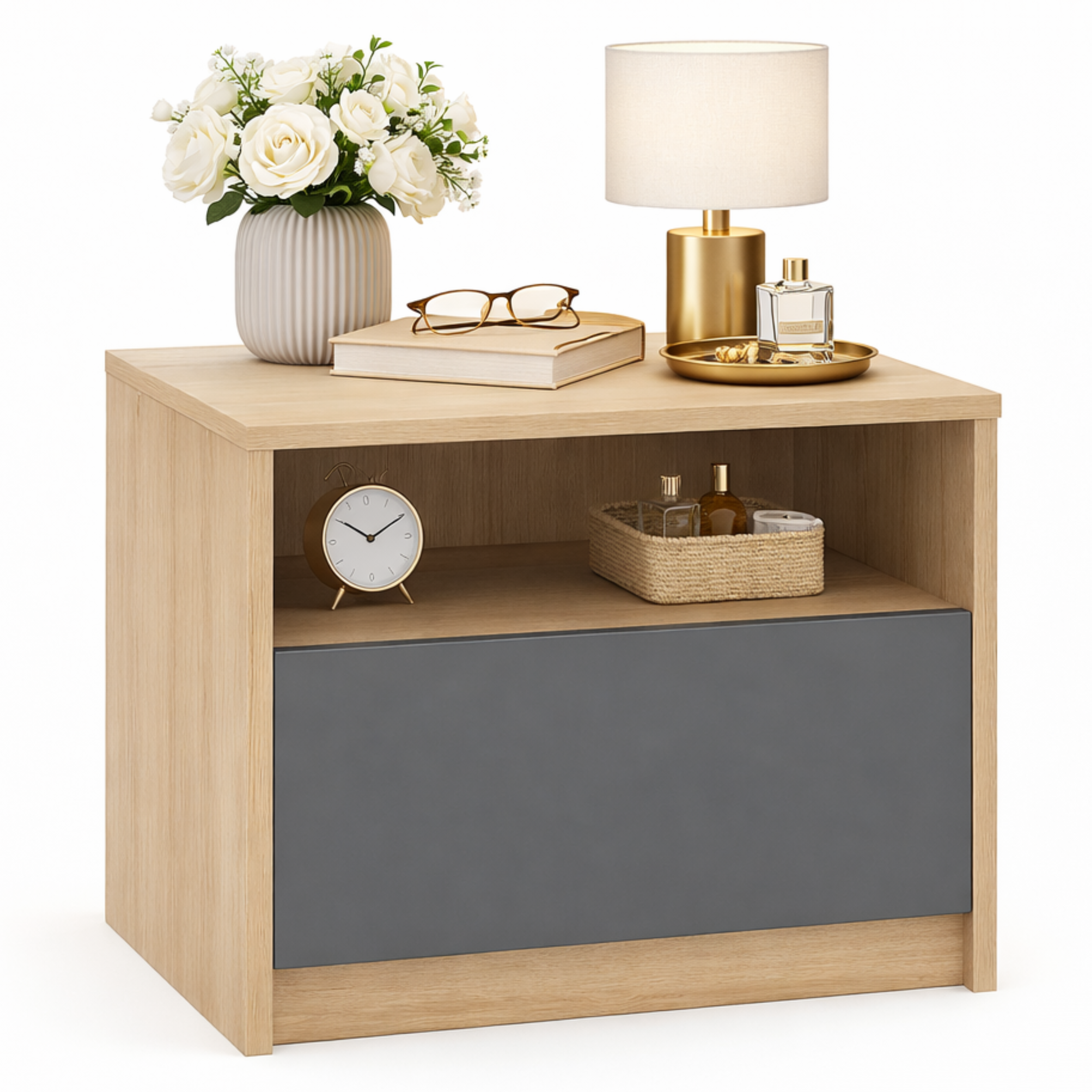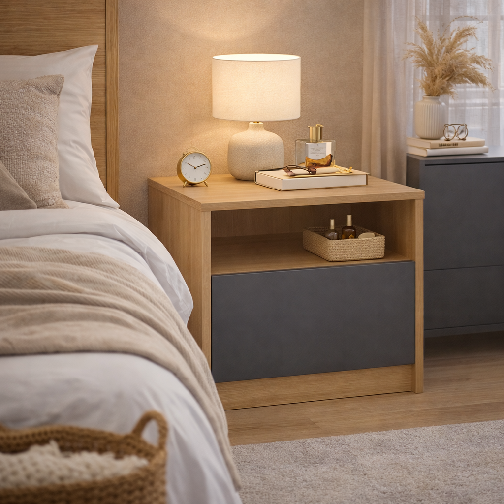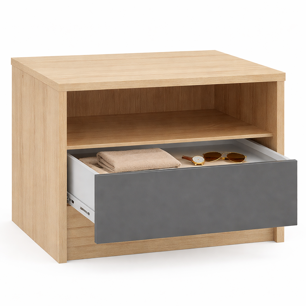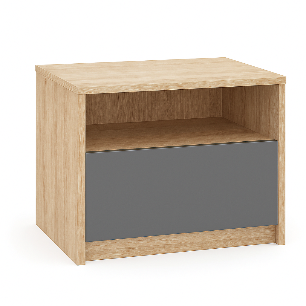 Model został zaprojektowany z myślą o osobach ceniących porządek i prostą formę. Zamknięta komora pozwala schować drobiazgi, takie jak książki, ładowarki czy akcesoria, dzięki czemu przestrzeń przy łóżku pozostaje uporządkowana.