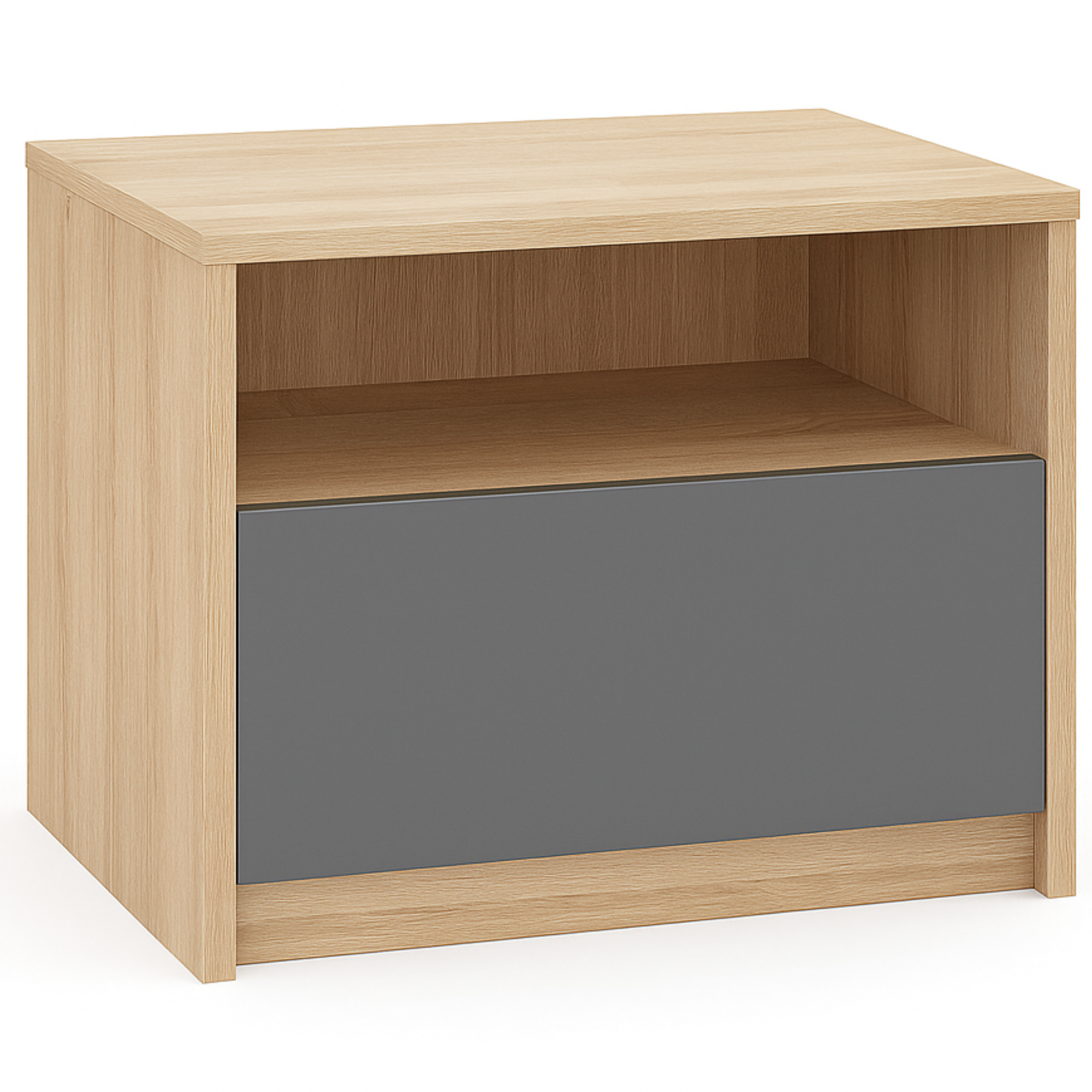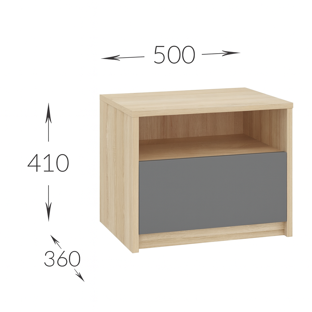 Szafka nocna wyróżnia się podwyższonym frontem, który nadaje meblowi elegancki i nowoczesny wygląd.Dzięki uniwersalnej stylistyce szafka nocna sprawdzi się zarówno w nowoczesnych, jak i bardziej klasycznych aranżacjach sypialni. Kompaktowe wymiary czynią ją idealnym wyborem także do mniejszych pomieszczeń.