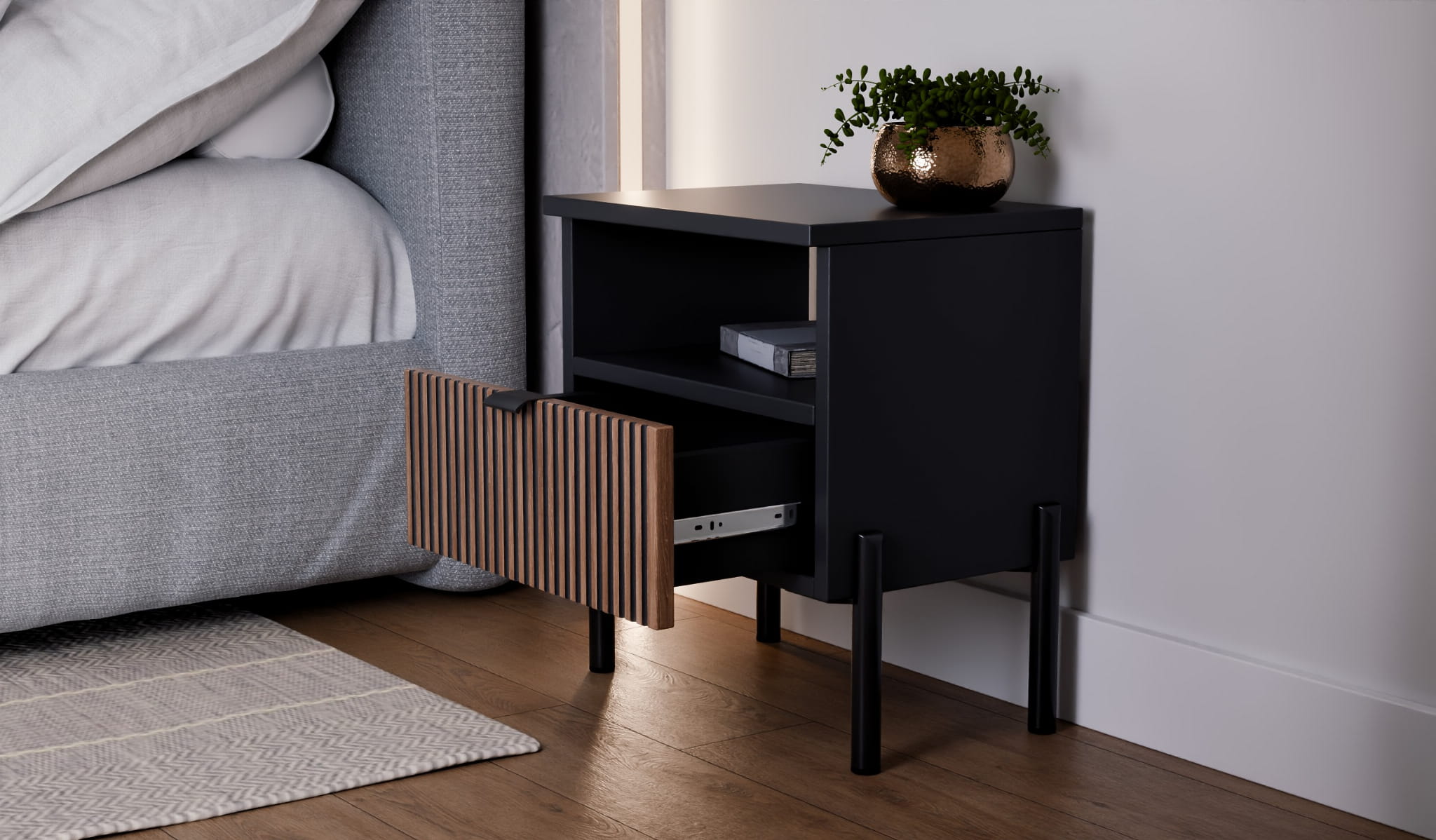 Wybierz naszą szafkę nocną z ryflowanym frontem – funkcjonalny i elegancki mebel od polskiego producenta, który dopełni wystrój Twojej sypialni. Zamów już dziś i ciesz się wysoką jakością oraz nowoczesnym designem!