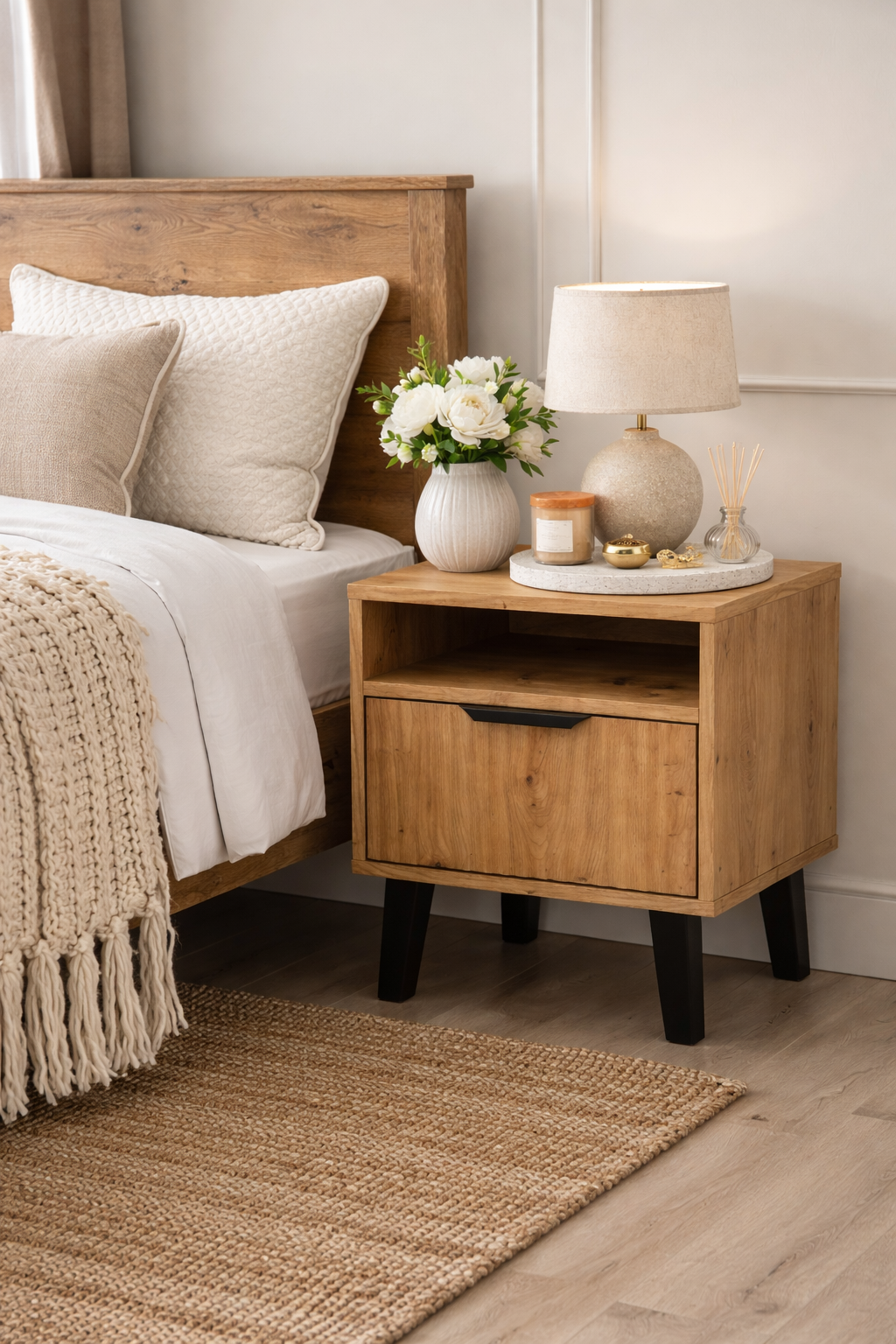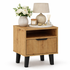 Szafka nocna do sypialni w kolorze dąb artisan to idealne połączenie nowoczesnego designu i praktycznych rozwiązań do codziennego użytkowania. Kompaktowa forma oraz ciepła kolorystyka inspirowana naturalnym drewnem sprawiają, że mebel doskonale komponuje się zarówno z przytulnymi, jak i nowoczesnymi aranżacjami wnętrz.
