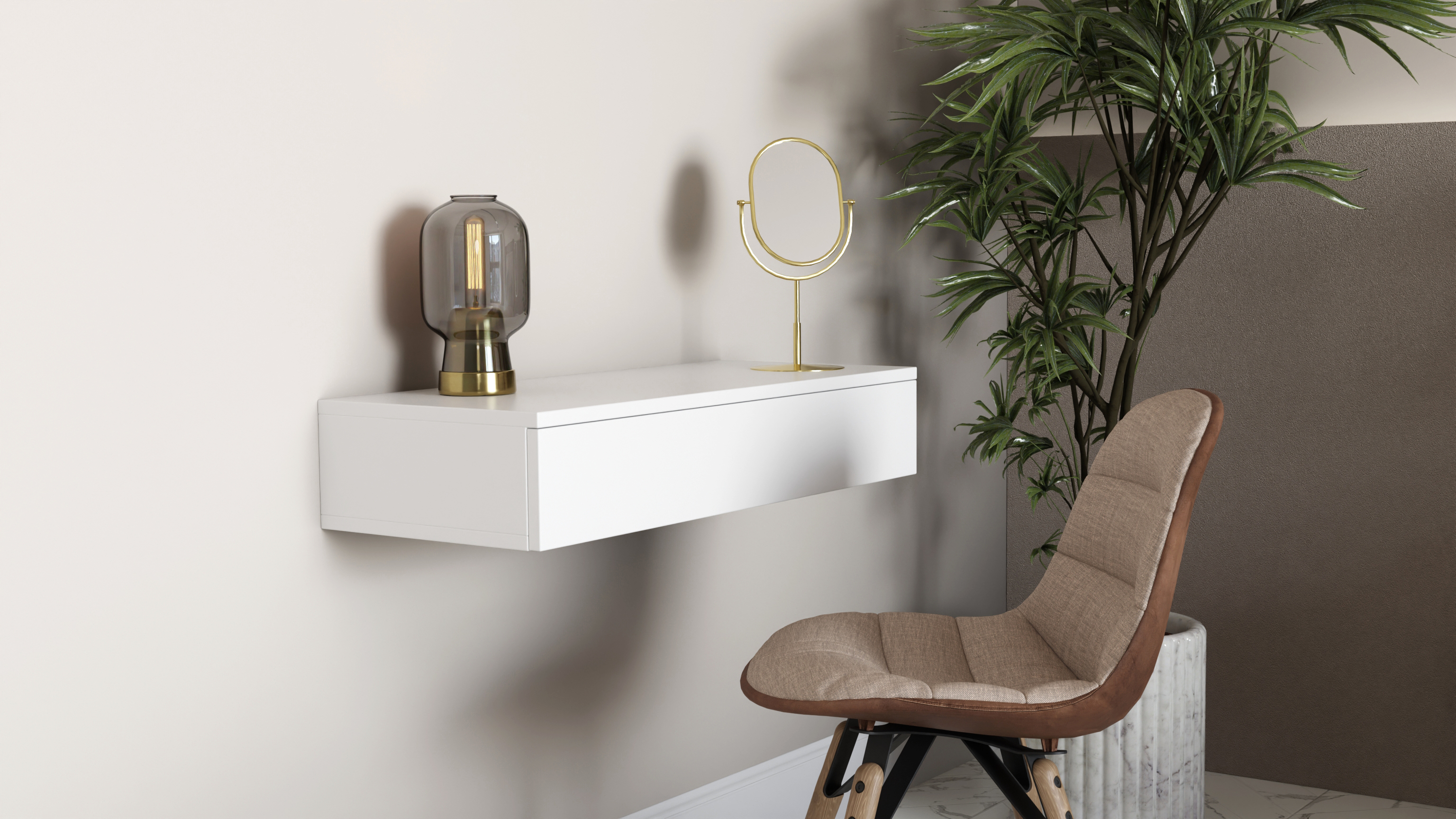 Prezentujemy elegancką toaletkę wiszącą w kolorze białym, która doskonale wpisuje się w nowoczesne wnętrza sypialni, salonu oraz przedpokoju. Toaletka łączy w sobie estetykę i funkcjonalność – dzięki podwieszanej konstrukcji nadaje wnętrzu lekkości, a jednocześnie oferuje praktyczny schowek na wszystkie niezbędne akcesoria.