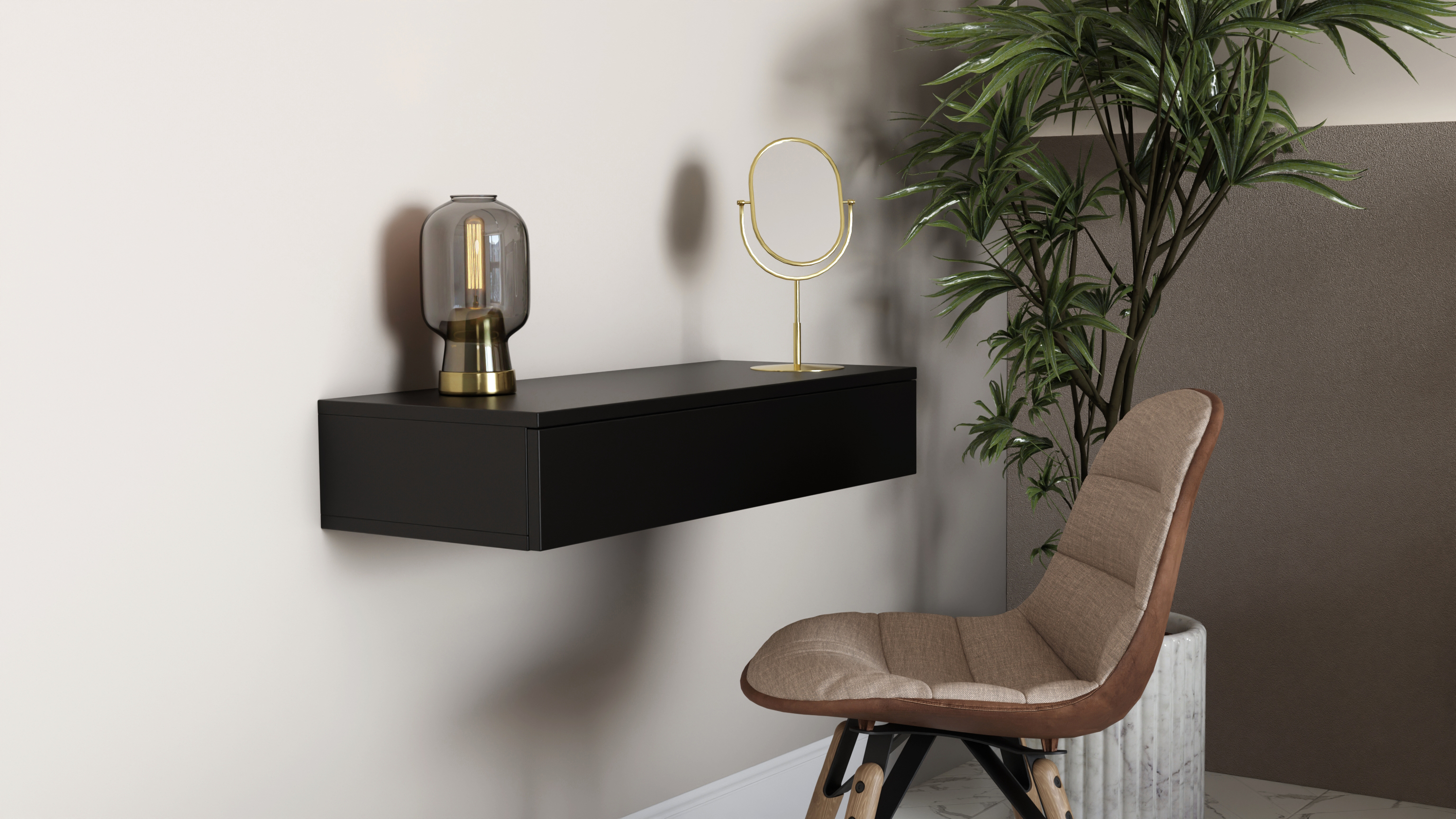 Prezentujemy elegancką toaletkę wiszącą w kolorze czarnym, która doskonale wpisuje się w nowoczesne wnętrza sypialni, salonu oraz przedpokoju. Toaletka łączy w sobie estetykę i funkcjonalność – dzięki podwieszanej konstrukcji nadaje wnętrzu lekkości, a jednocześnie oferuje praktyczny schowek na wszystkie niezbędne akcesoria.