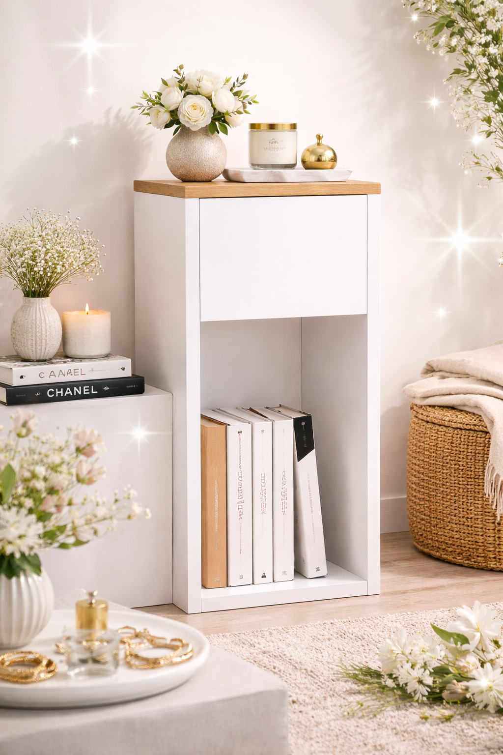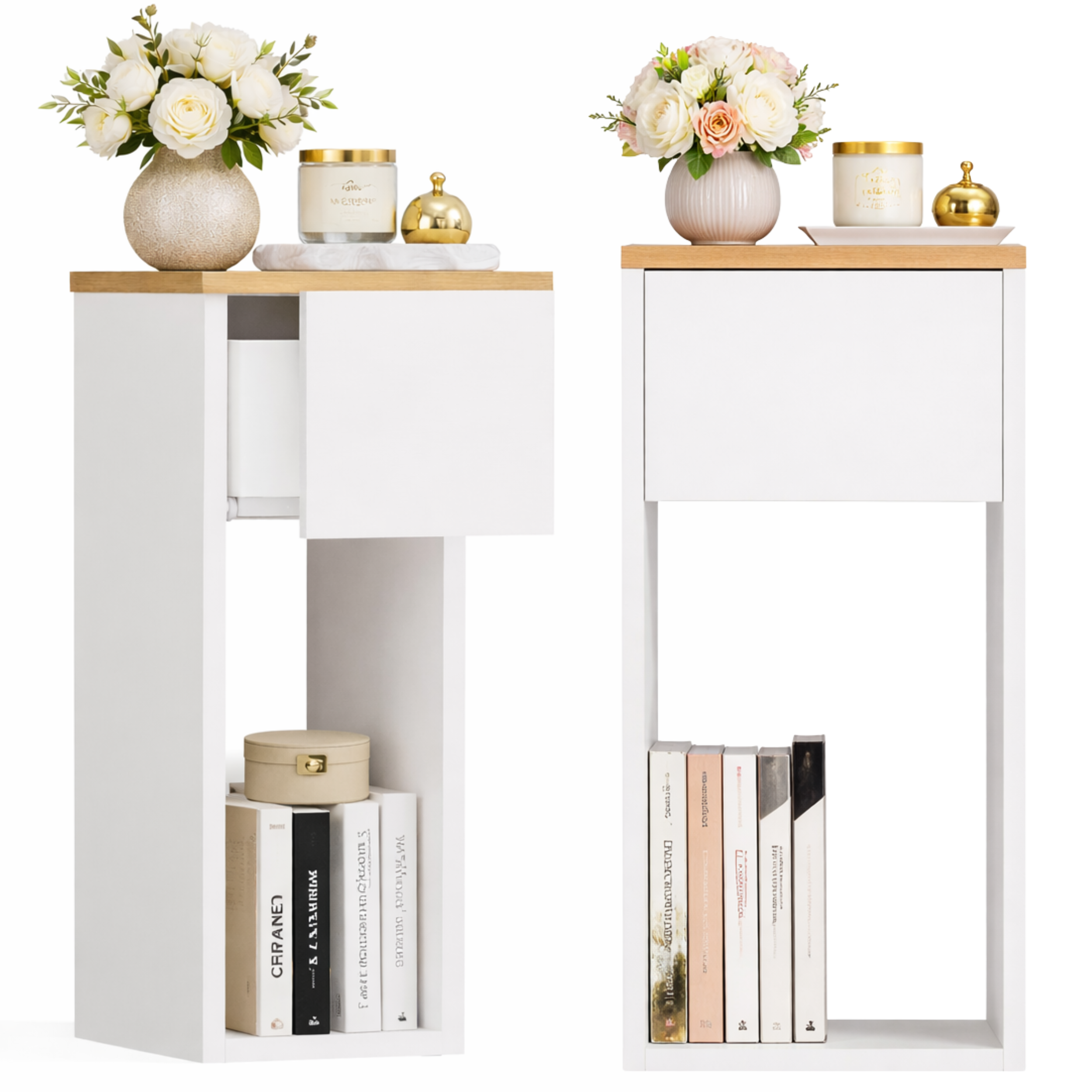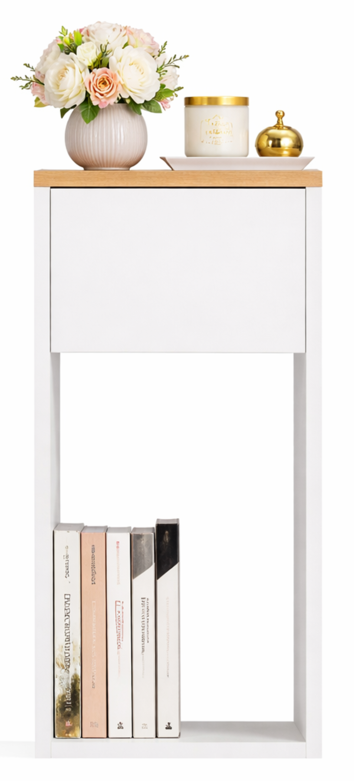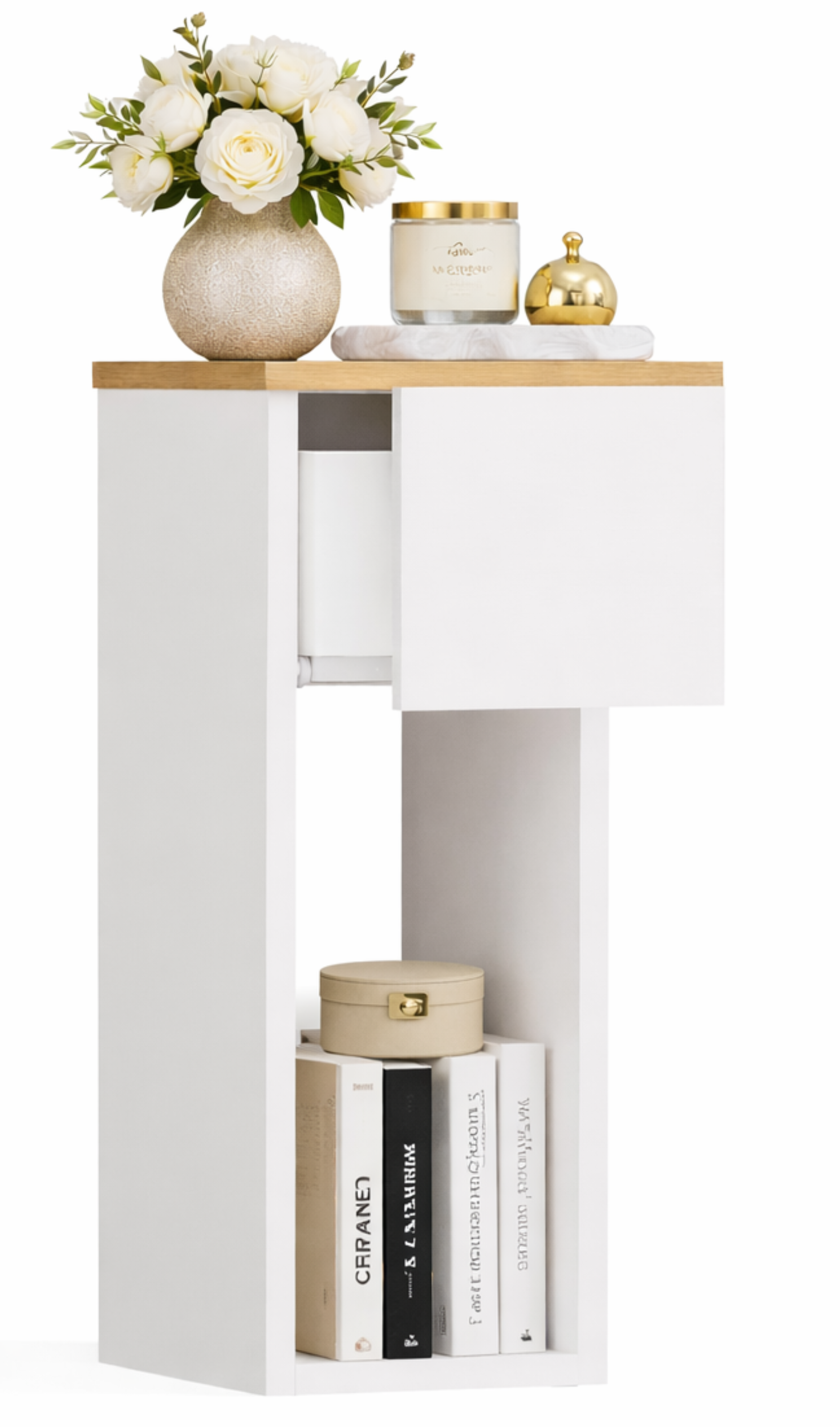 Wąska szafka nocna z szufladą i półką biała z blatem dąb artisan