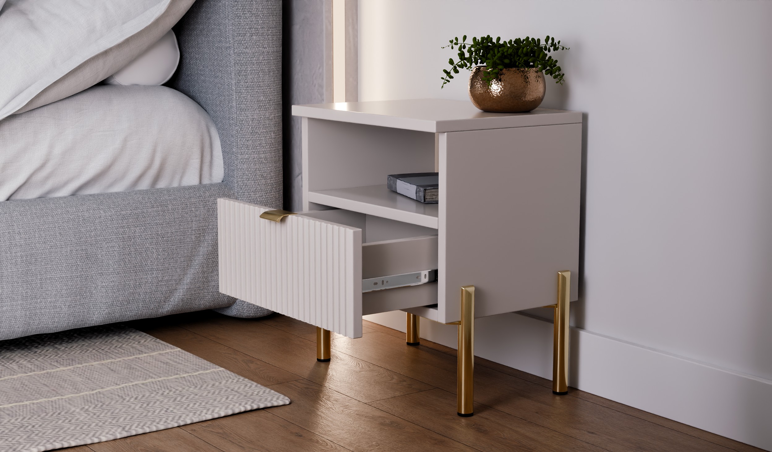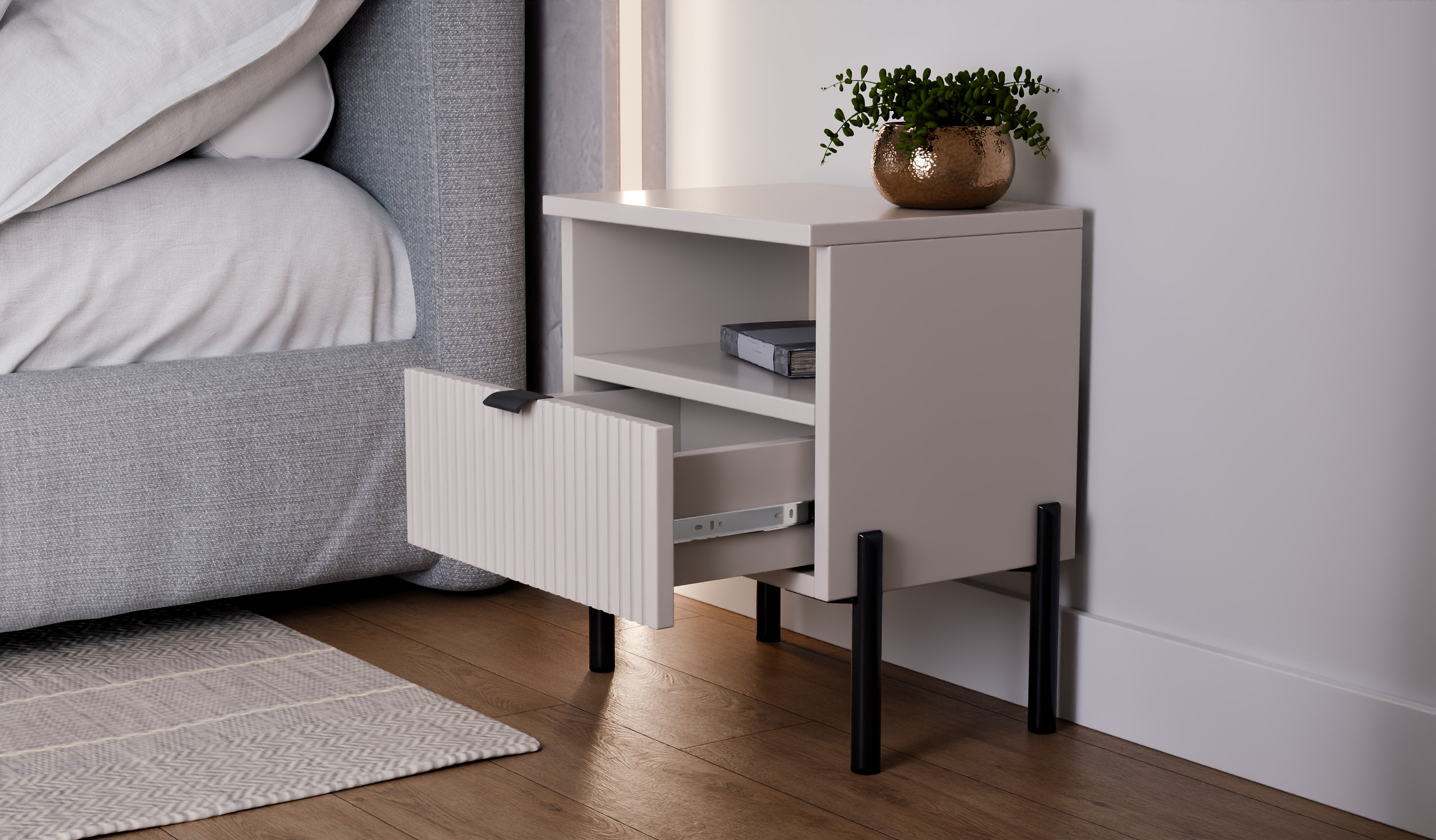 Szafka nocna do sypialni – stolik nocny Kaszmir z ryflowaną szufladą